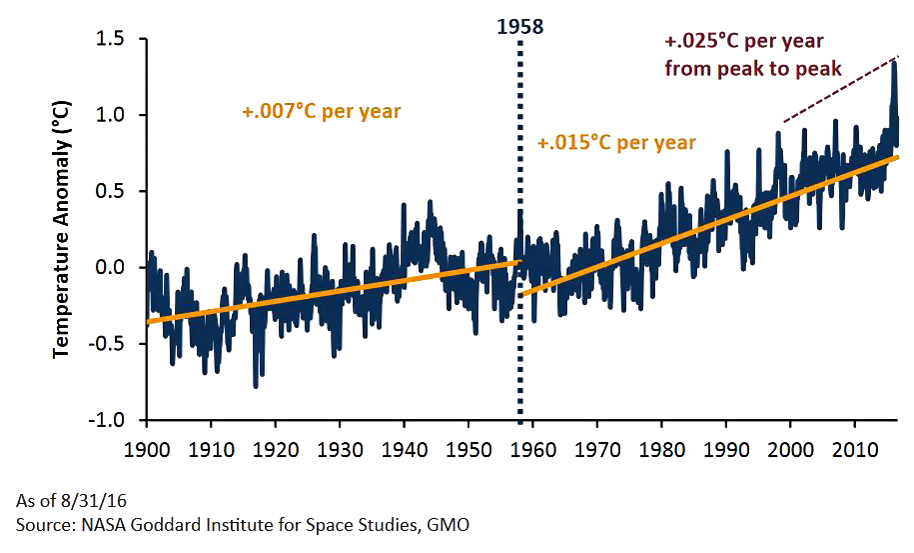 A. Global temperature is 1°C warmer than before industrialisation. Most of that warming has happened very recently and it is accelerating (presently by 0.2°C per decade).